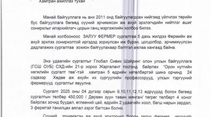 "Залуу фермер" сургалт зохион байгуулагдана.