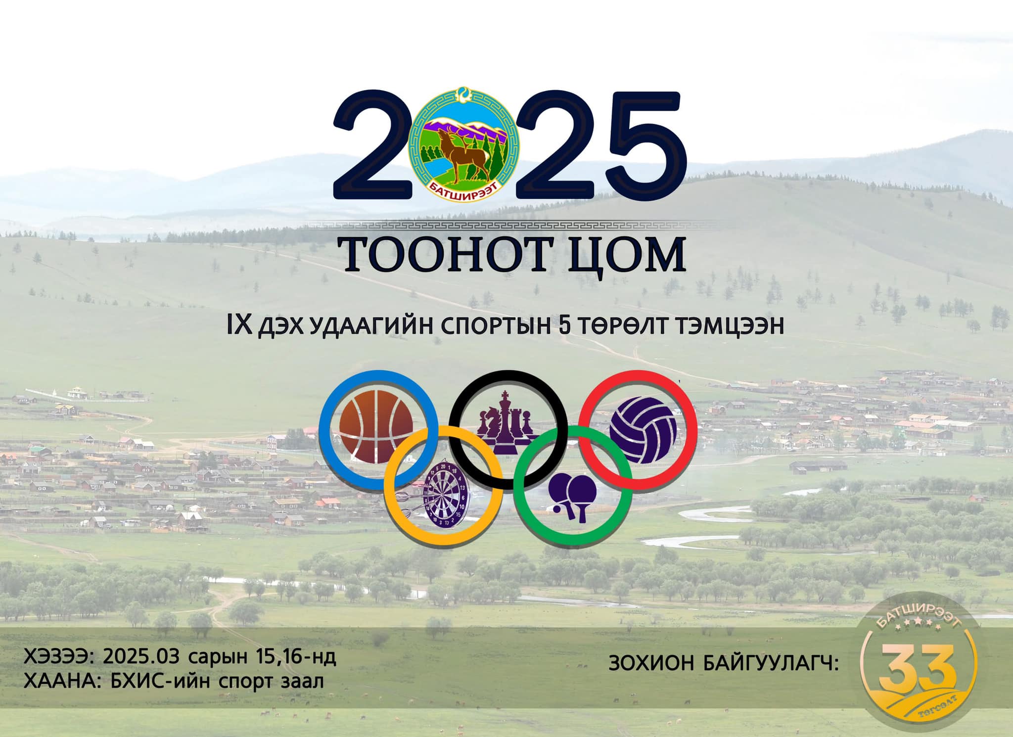 Батширээт сумын ЕБС-ийн үе үеийн төгсөгч нарын дунд зохион байгуулагддаг 9 дэх удаагийн “ТООНОТ ЦОМ-2025” спортын 5 төрөлт тэмцээн 2025 оны 03 сарын 15, 16-ны өдрүүдэд Улаанбаатар хотод зохион байгуулагдахаар боллоо.