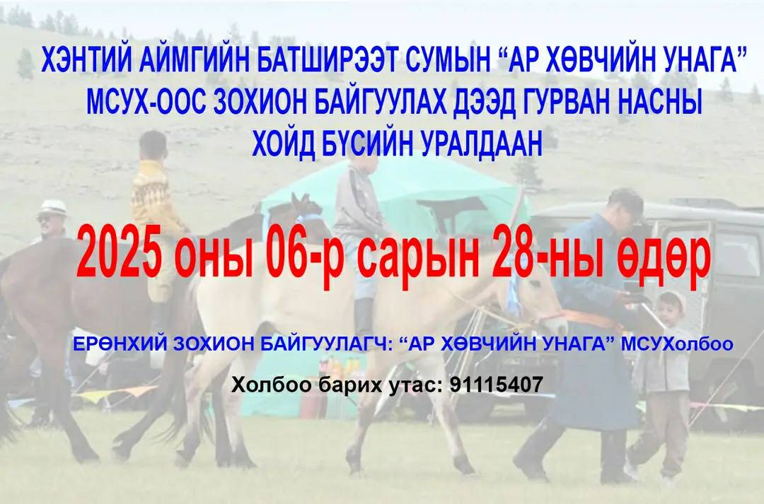 Батширээт суманд 2025.06.28-нд дээд 3 насны Хойд бүсийн уралдаан болно.