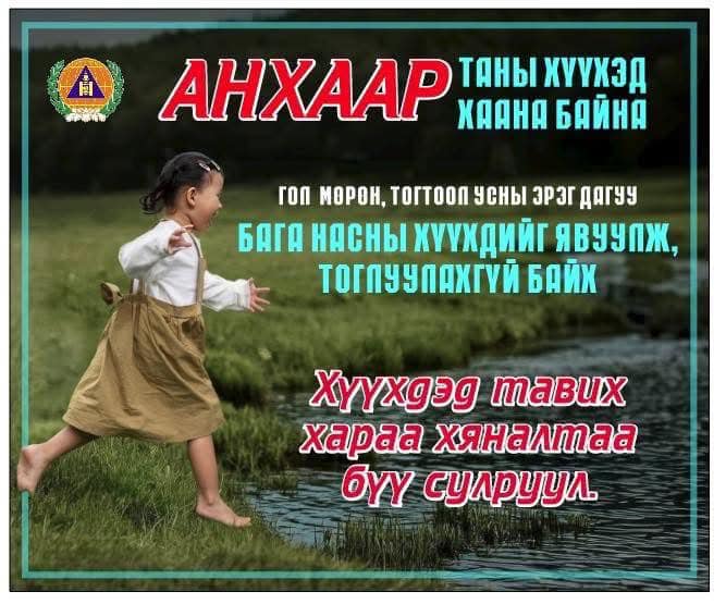 Гол, нуурын эрэг дагуу амарч, зугаалахдаа бага насны хүүхдэд тавих хараа хяналтаа сайжруулж, ганцааранг нь үлдээхгүй байх, харгалзах хүнгүй тоглуулахгүй байхыг анхааруулж байна.