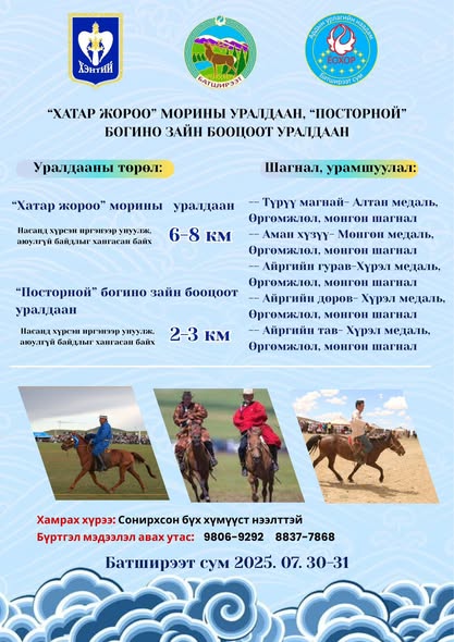 "ЁОХОР ХАТАР-2025" Ардын урлагийн наадмын “ХАТАР ЖОРОО” МОРИНЫ УРАЛДААН, “ПОСТОРНОЙ” БОГИНО ЗАЙН БООЦООТ УРАЛДААН