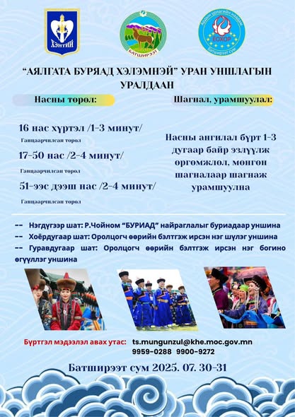 "ЁОХОР ХАТАР-2025" Ардын урлагийн наадмын “АЯЛГАТА БУРЯАД ХЭЛЭМНЭЙ” УРАН УНШЛАГЫН УРАЛДААН