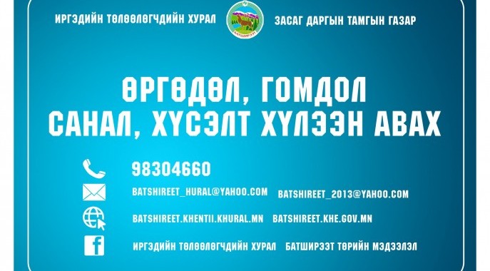 Иргэн та манай байгууллагын талаар мэдээлэл, өргөдөл, гомдол, санал, хүсэлт уламжлах бол 98304660 утас, batshireet_hural@yahoo.com цахим шуудан, batshireet.khentii.khural.mn цахим хаяг, "Иргэдийн төлөөлөгчдийн хурал" фейсбүүк хуудас болон ИТХ-ын ажлын алб