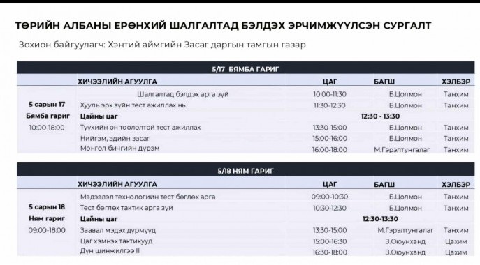 ТӨРИЙН АЛБАНЫ ЕРӨНХИЙ ШАЛГАЛТАД БЭЛДЭХ ЭРЧИМЖҮҮЛСЭН СУРГАЛТ