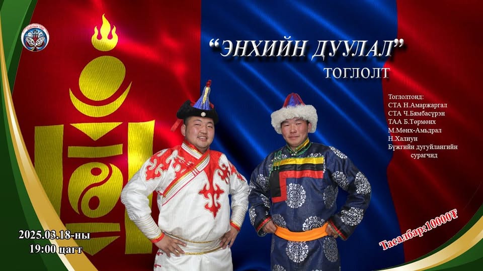 Монгол Улсын орчин цагийн зэвсэнт хүчин үүсэн байгуулагдсаны 104 жилийн ой, "Монгол цэргийн баярын өдөр"-ийг тохиолдуулан Ардын авьяастан Э.Эрхэмбаяр, С.Эрч нарын хамтарсан "Энхийн дуулал" тоглолт 2025.03.18-ны өдрийн 19:00 цагт ганцхан удаа тоглогдох гэж байна.