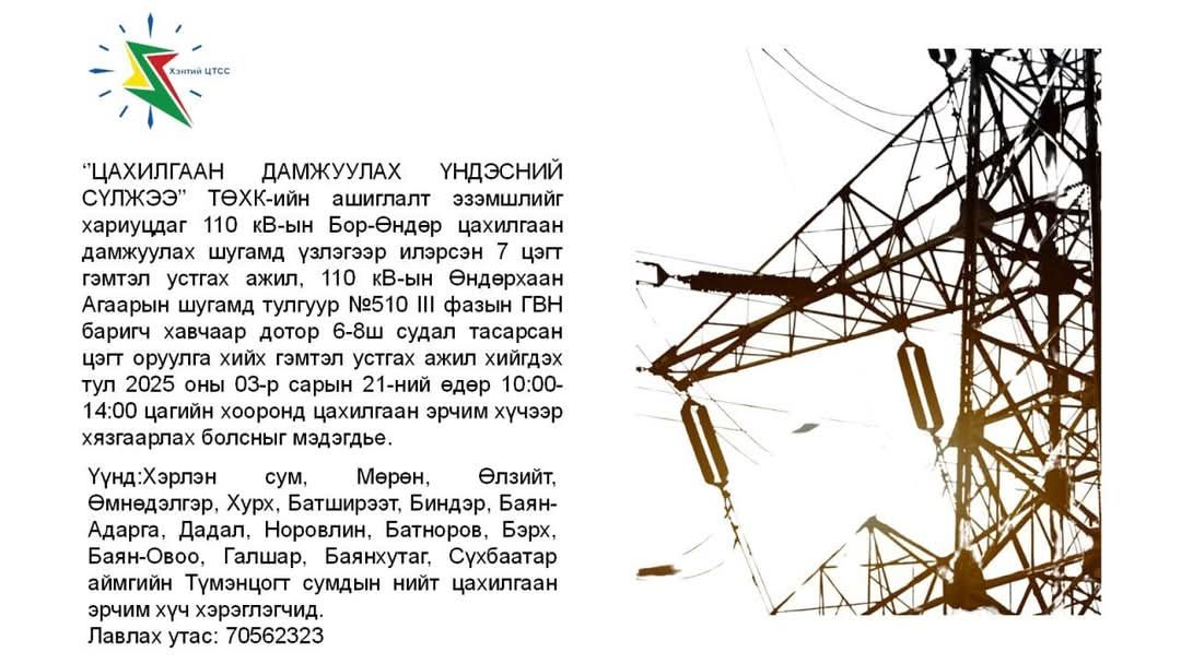 "Цахилгаан дамжуулах үндэсний сүлжээ" ТӨХК-ийн ашиглалт эзэмшлийг хариуцдаг 110 кВ-ын Бор-Өндөр цахилгаан дамжуулах шугамд үзлэгээр илэрсэн 7 цэгт гэмтэл устгах ажил, 110 кВ-ын Өндөрхаан агаарын шугамд тулгуур 510 III вазын ГВН баригч хавчаар дотор 6-8ш судал тасарсан цэгт оруулга хийх, гэмтэл устгах ажил хийх тул 2025 оны 03 дугаар сарын 21-ний өдөр 10:00-14:00 цагийн хооронд цахилгаан эрчим хүчээр хязгаарлах болсныг мэдэгдье.