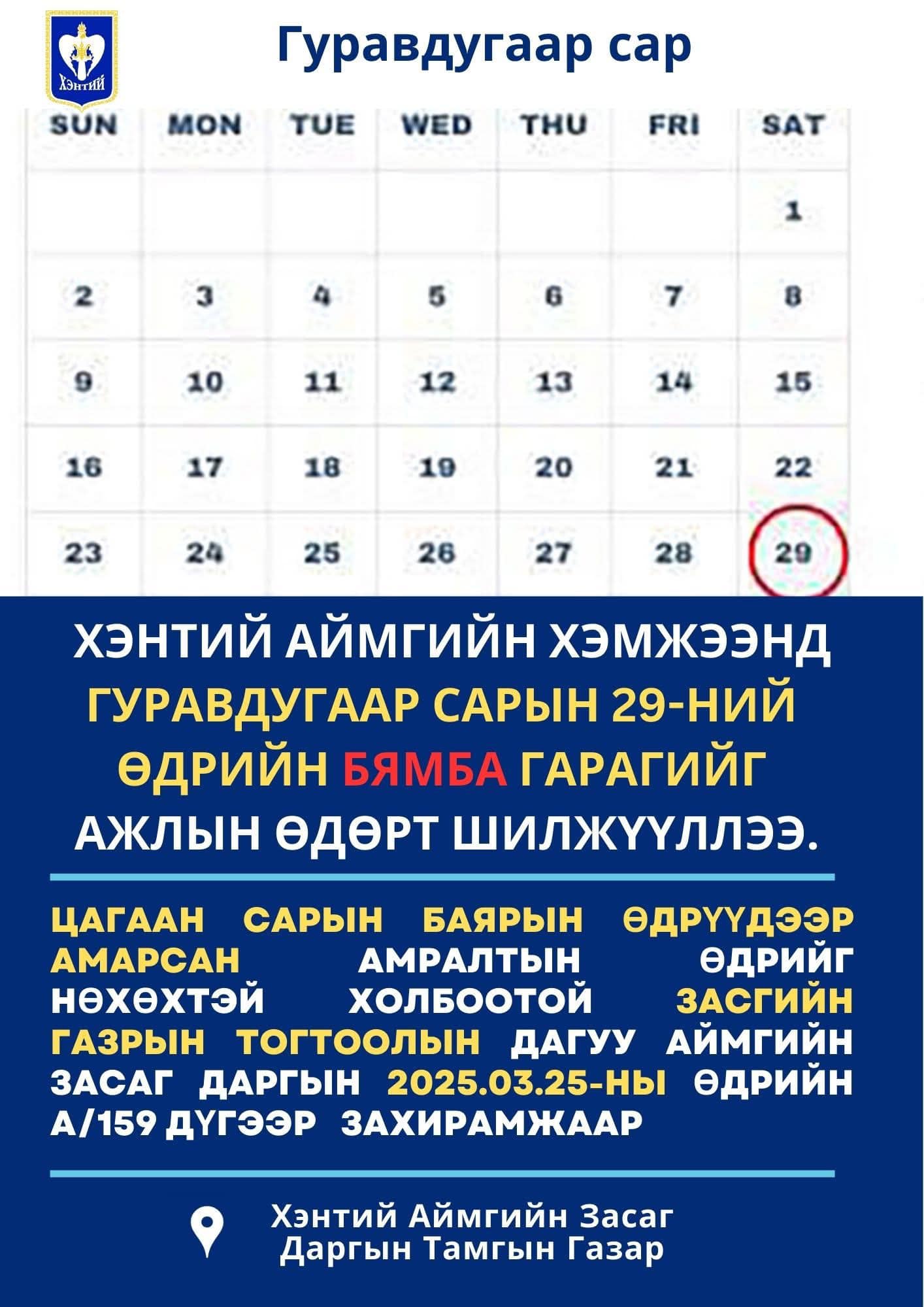 ХЭНТИЙ АЙМГИЙН ХЭМЖЭЭНД 3 ДУГААР САРЫН 29-НИЙ ӨДРИЙН БЯМБА ГАРАГИЙГ АЖЛЫН ӨДӨРТ ШИЛЖҮҮЛЛЭЭ.