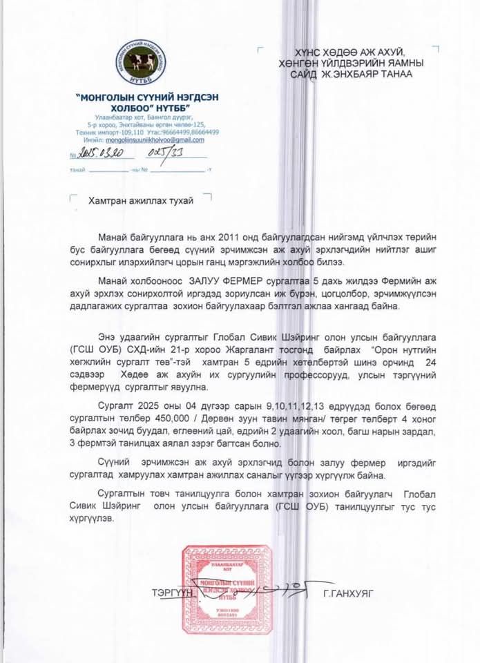"Монголын сүүний нэгдсэн холбоо" НҮТББ нь 2025 оны 04 дүгээр сарын 09-13-ны өдрүүдэд "Залуу фермер" сургалт зохион байгуулахаар төлөвлөсөн байна. Хоршоо байгуулж энэ чиглэлээр зээл авсан малчид та бүхэн минь энэ сургалтад хамрагдаж хэрэгтэй мэдээллээ цаг алдалгүй авахыг хүсье.