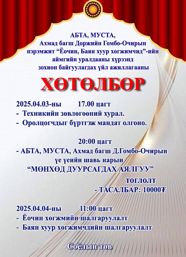 АБТА, МУСТА, Ахмад багш Доржийн Гомбо-Очирын нэрэмжит "Ёочин, Баян хуур хөгжимчид"-ийн аймгийн уралдааны хүрээнд зохион байгуулагдах үйл ажиллагааны хөтөлбөр