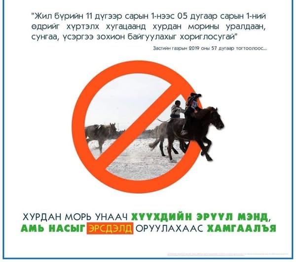 Хэнтий аймгийн хэмжээнд 2025 оны 05 дугаар сарын 01-ний өдрийг хүртэлх хугацаанд хурдан морины уралдаан, тэмцээн, үсэргээ, сунгааныг хориглосон аймгийн Засаг даргын шийдвэр гарсан. Үүнтэй холбогдуулан хууль бус зохион байгуулж буй уралдаан тэмцээний талаар төлбөртэй мэдээлэл иргэдээс авах юм байна.