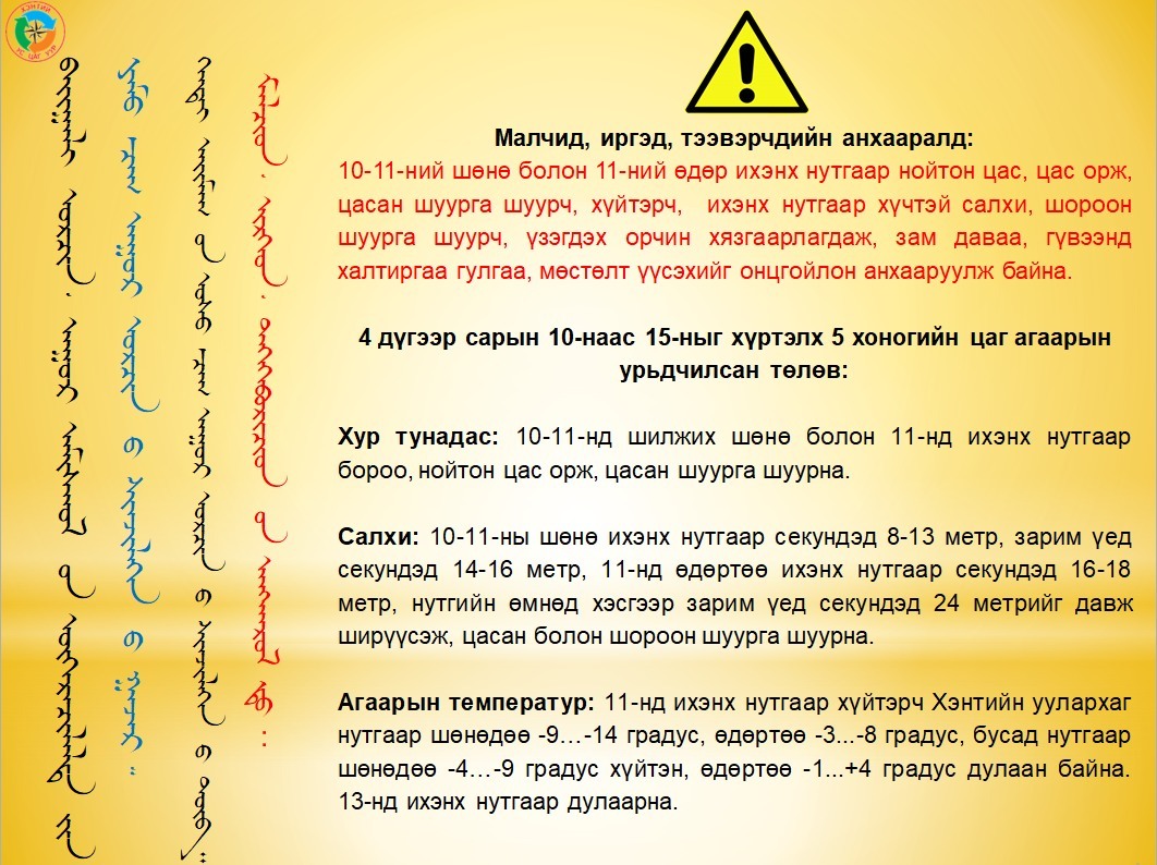 2025 ОНЫ 04 ДҮГЭЭР САРЫН 10-11-НД шилжих шөнө ихэнх нутгаар НОЙТОН ЦАС ОРЖ, ЦАСАН ШУУРГА ШУУРАХ, ЗАМ ДАВААД ХАЛТИРГАА ГУЛГАА ҮҮСЭХ ЭРСДЭЛТЭЙ тул малчид, иргэд, тээвэрчид та бүхэн болзошгүй эрсдэлээс өөрсдийгөө хамгаалан бэлэн байдлаа хангаж ажиллана уу!!!
