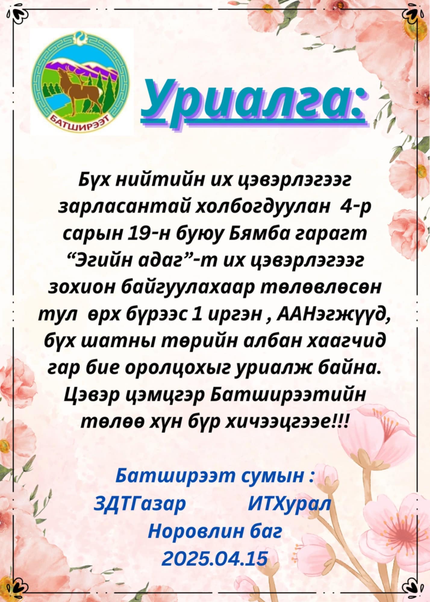 БҮХ НИЙТИЙН ИХ ЦЭВЭРЛЭГЭЭНД ИДЭВХТЭЙ ОРОЛЦОХЫГ УРИАЛЖ БАЙНА.