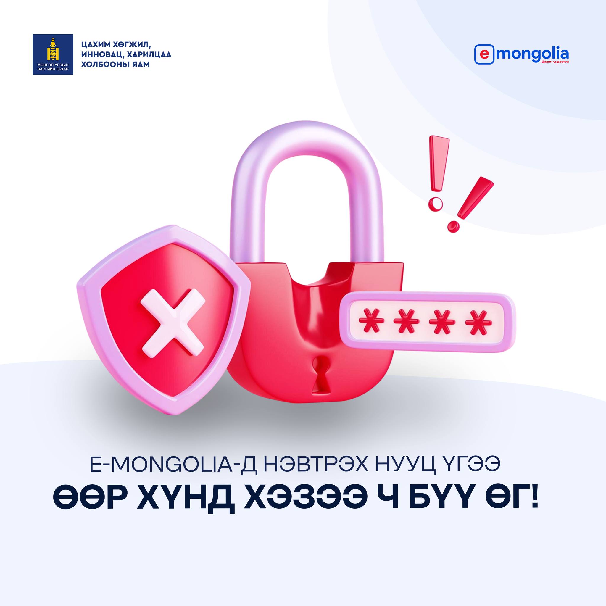 E-Mongolia системд нэвтрэх нууц үгээ хэнд ч, ямар ч нөхцөлд дамжуулахгүй байх нь таны мэдээллийн аюулгүй байдлыг хангах хамгийн эхний алхам.