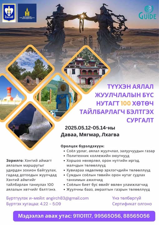 Орон нутгийнхаа түүх, байгаль, соёлыг сонирхон судалдаг, цаашид танай нутгийг зорин ирэх жуулчдад хөтөч хийх, нутаг орноо танилцуулах чадвартай иргэдийг дээрх сургалтад хамрагдахыг урьж байна.