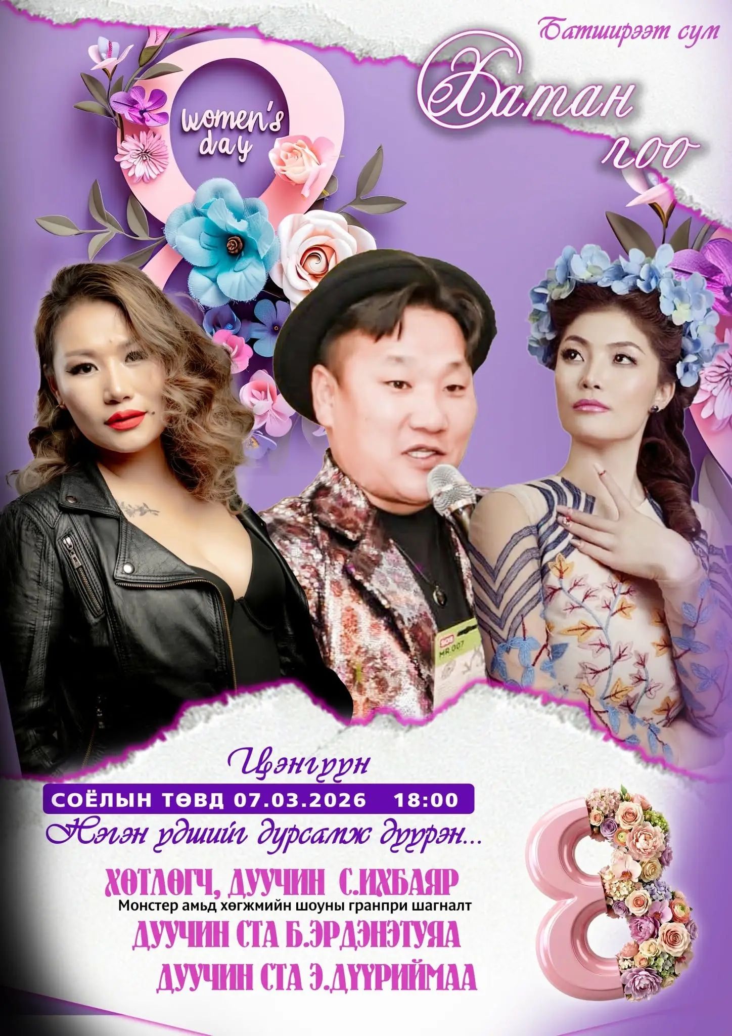 Олон улсын эмэгтэйчүүдийн эрхийг хамгаалах өдрийг тохиолдуулан сумын Эмэгтэйчүүдийн зөвлөлөөс "Хатан гоо" цэнгүүнийг 2026 оны 03 дугаар сарын 07-ны өдөр зохион байгуулах тул эмэгтэйчүүд, бүсгүйчүүд, залуучууд та бүхнийг энэхүү арга хэмжээнд оролцож нэгэн үдшийг дурсамж дүүрэн өнгөрүүлэхийг урьж байна.