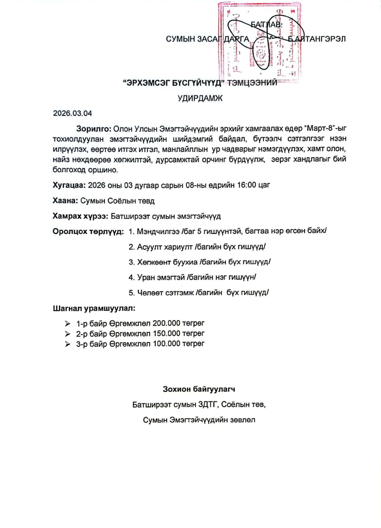 2026 оны 03 сарын 08-ны 16 цагт Соёлын төвд зохион байгуулагдана.